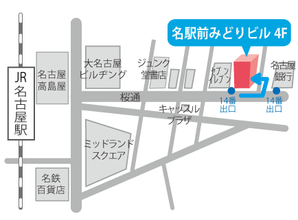 アクセス スクール外観 アスクオープンカレッジは、地下鉄名古屋駅、JR線・名城線・近鉄線の各線より徒歩6分、地下鉄国際センター駅より徒歩3分で色々な地域の方にお越しいただいています。地下街直結(ユニモール)12番出口または14番よりすぐ!通学にとても便利な場所にあります! アクセス 名古屋市中村区名駅3-22-4名駅前みどりビル4FTEL052-533-3568 電車をご利用の方 名古屋駅(JR・名鉄・近鉄・地下鉄)より徒歩6分 ・JR線 広小路口 ・名鉄線 中央改札口 ・地下鉄東山線 南改札口 ・地下鉄桜通線 国際センター駅 徒歩3分 ・地下街ユニモール 12番出口、14番出口 お車をご利用の方 近隣有料駐車場をご利用ください。※駐車料金はご負担願います。 ・エムテックロイメントパーキング・名鉄協商パーキング お見積りお問い合わせはこちら